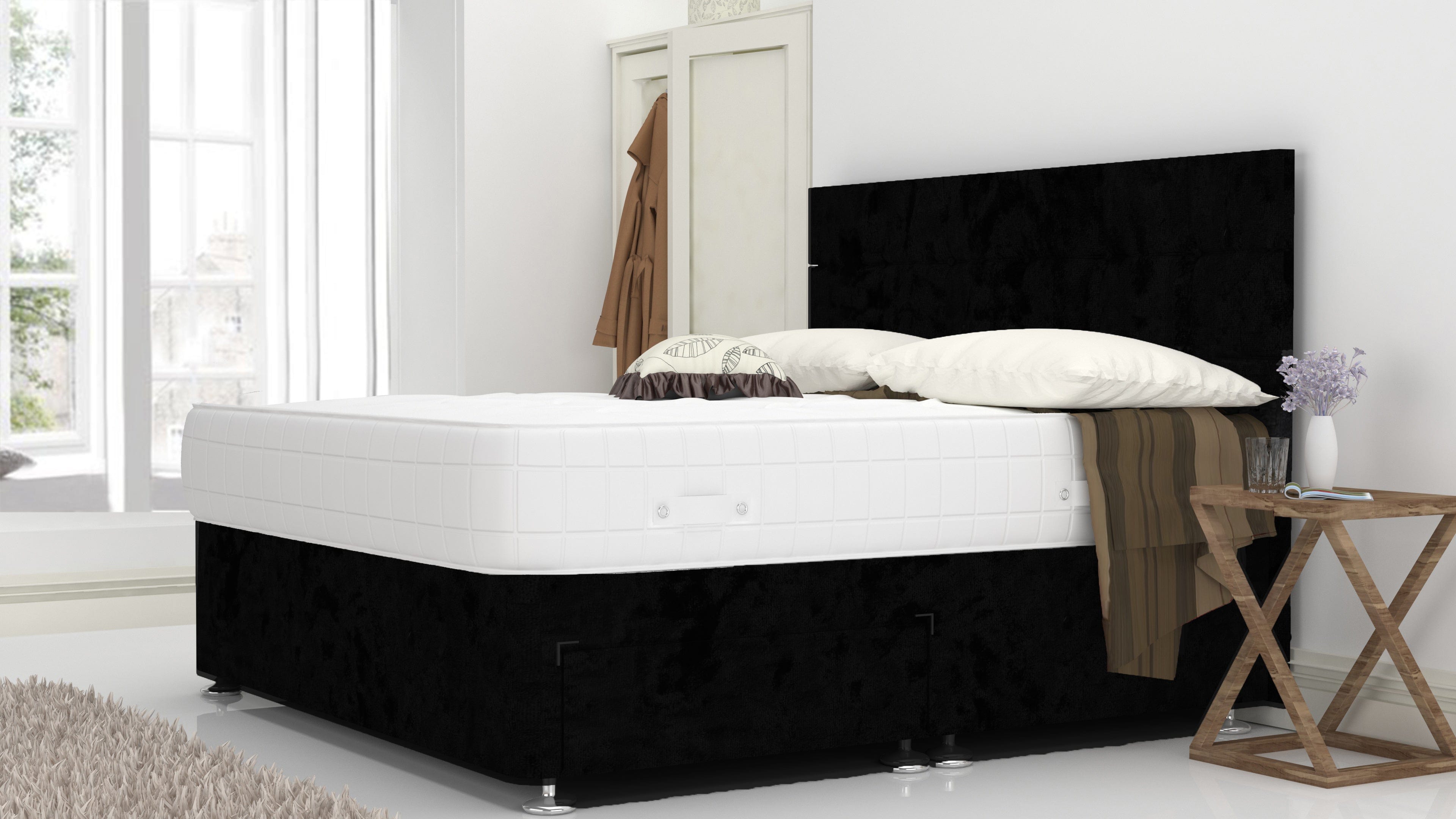 Black Crushed 3 Feet Divan Bed Set With Cube Headboard (Included Feet) And Free Orthopedic Mattress