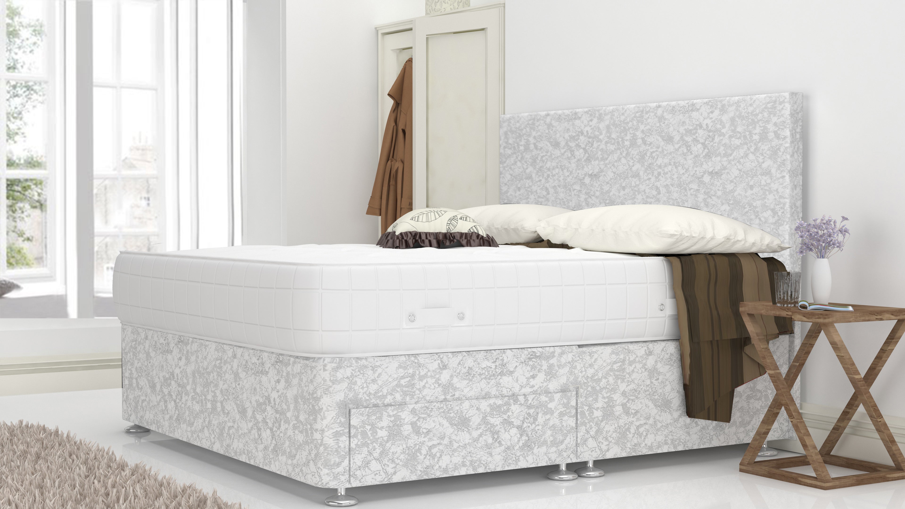White Crushed Velvet 3 Feet Divan Bed With Plain Headboard (Included Feet) And Free Memory Foam Mattress